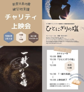 2月3日(土)にほとり座で開催されます「ひとにぎりの塩」チャリティー上映会にて、珠洲の奥能登の塩を使った「高道フィナンシェよいもの石川」をチャリティー販売いたしします。販売価格1,500円のうち、300円を寄付金とさせていただきます。