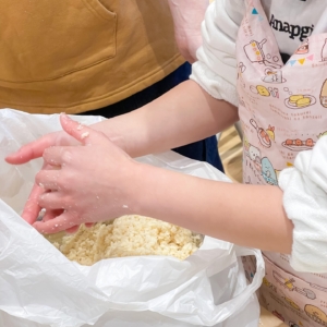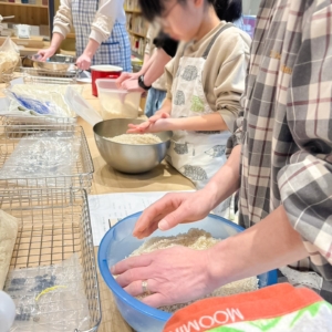 南砺市福光の法野麹店の米麹と五箇山のねこのくら工房のおからと有機豆乳で味噌作りを行いました。はじめて味噌作りをする方でも簡単に自家製手前味噌を作っていただくことができました。